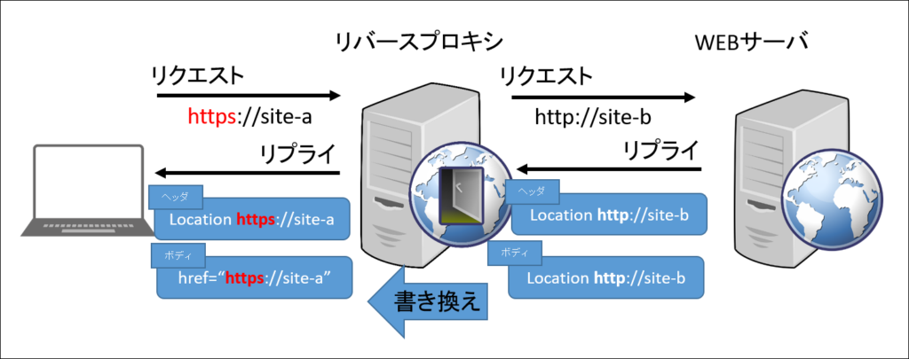外部PC–インターネット—–<ルータ>–<リバースプロキシサーバ>–<WEBサーバ>